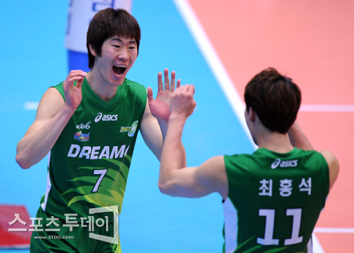 [성남=스포츠투데이 정재훈 기자] 25일 오후 성남실내체육관에서 열린 'NH 농협 2011-2012 V리그' 남자부 상무 신협과 드림식스의 경기에서 득점에 성공한 최귀엽이 최홍석과 하이파이브하고 있다.
