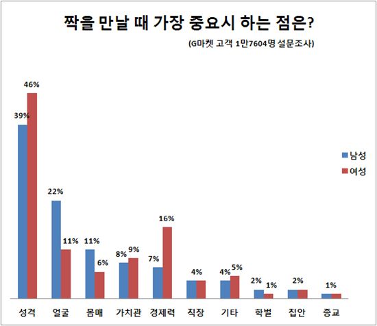 설문에서 남성의 39%와 여성의 46%가 성격을 1순위로 꼽았다. 두 번째로 중요하게 생각하는 것으로 남성은 얼굴(22%)을 꼽았고, 여성은 ‘경제력(16%)를 선택했다.