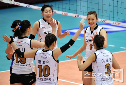 [수원=스포츠투데이 정재훈 기자] 8일 오후 수원 실내체육관에서 열린 '2011-2012 NH 농협 V리그' 여자부 현대건설과 도로공사의 경기에서 득점을 올린 도로공사 선수들이 환호하고 있다.