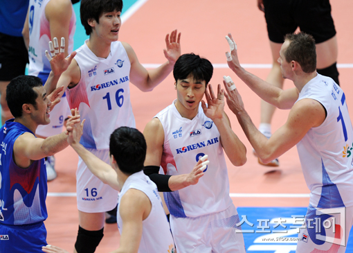 [인천=스포츠투데이 정재훈 기자] 9일 오후 인천 시립도원체육관에서 열린 '2011-2012 NH 농협 V리그' 남자부 대한항공과 현대캐피탈의 경기에서 득점을 올린 뒤 동료들에게 둘러싸여 있는 김학민.