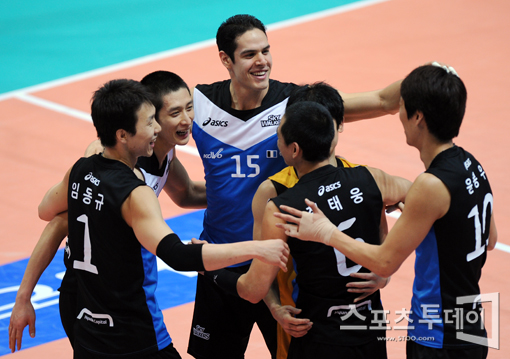 [인천=스포츠투데이 정재훈 기자] 9일 오후 인천 시립도원체육관에서 열린 '2011-2012 NH 농협 V리그' 남자부 대한항공과 현대캐피탈의 경기에서 득점을 올린 현대캐피탈 선수들이 환호하고 있다.