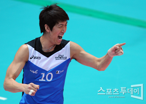 [인천=스포츠투데이 정재훈 기자] 9일 오후 인천 시립도원체육관에서 열린 '2011-2012 NH 농협 V리그' 남자부 대한항공과 현대캐피탈의 경기에서 득점을 올린 윤봉우가 동료를 향해 미소를 짓고 있다.