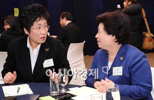 [아시아경제 양지웅 기자] 10일 서울 대방동 여성플라자에서 열린 '2012 신년 여성정책 간담회' 에서 김금래 여성가족부장관(오른쪽)과 김정숙 한국여성단체협의회장이 대화를 나누고 있다.