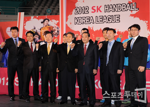 [스포츠투데이 정재훈 기자] 13일 오후 방이동 SK 핸드볼 경기장에서 '2012 SK 핸드볼 코리아 리그' 미디어데이가 열렸다. 남자부 감독 및 선수들이 화이팅을 외치고 있다.