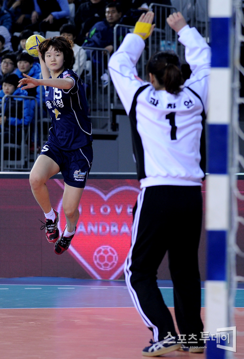 [스포츠투데이 정재훈 기자] 14일 오후 SK핸드볼경기장에서 열린 '2012 SK핸드볼코리아리그' 경남개발공사와 서울시청의 경기에서 서울시청 최수민이 슛을 쏘고 있다.