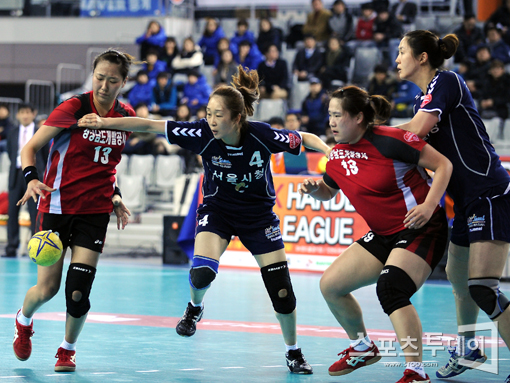 [스포츠투데이 정재훈 기자] 14일 오후 SK핸드볼경기장에서 열린 '2012 SK핸드볼코리아리그' 경남개발공사와 서울시청의 경기에서 서울시청 송미례가 드리블하는 경남개발공사 김은경을 막아서고 있다.