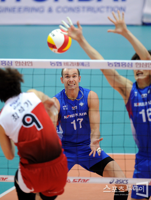 [수원=스포츠투데이 정재훈 기자] 16일 오후 수원실내체육관에서 열린 '2011-2012 NH 농협 V리그' KEPCO와 대한항공의 경기에서 마틴이 상대의 스파이크를 받기 위해 포즈를 취하고 있다.