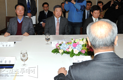 [스포츠투데이 정재훈 기자] 21일 오전 한국프레스센터 외신기자클럽에서 최관식 문화체육관광부 장관과 정몽규 K리그 총재, 구본능 KBO 총재, 한선교 KBL 총재, 김원길 WKBL총재, 박상설 한국배구연맹 사무총장 등 한국 프로 스포츠 수장들이 승부조작 등 체육계 현안문제 대책을 논의하고 있다.