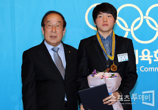 [스포츠투데이 정재훈 기자] 21일 오후 올림픽파크텔에서 제58회 대한체육회 체육상 시상식이 열렸다. 대상을 수상한 쇼트트랙 노진규가 박용성 대한체육회 회장과 기념촬영을 하고 있다.