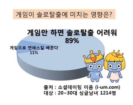 신개념 소개팅 서비스 이음은 지난 달 20일부터 29일까지 미혼남녀 1214명을 대상으로 ‘게임과 연애’에 대한 설문조사를 실시했다. 이 결과 10명 중 9명이 '게임은 솔로에 부정적인 영향을 미친다(89%)'라고 답했다. 커플이 되기 위해서는 게임보다는 현실세계에서 조금 더 노력하는 것이 좋다는 것.