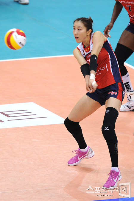 [수원=스포츠투데이 정재훈 기자] 7일 오후 수원실내체육관에서 열린 '2011-2012 NH 농협 V리그' 여자부 현대건설과 KGC 인삼공사의 경기에서 한유미가 상대의 서브를 리시브하고 있다.
