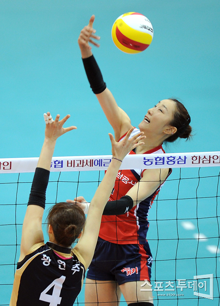 [수원=스포츠투데이 정재훈 기자] 7일 오후 수원실내체육관에서 열린 '2011-2012 NH 농협 V리그' 여자부 현대건설과 KGC 인삼공사의 경기에서 한유미가 공격을 시도하고 있다.