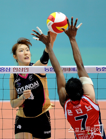 [수원=스포츠투데이 정재훈 기자] 7일 오후 수원실내체육관에서 열린 '2011-2012 NH 농협 V리그' 여자부 현대건설과 KGC 인삼공사의 경기에서 황연주가 스파이크를 때리고 있다.