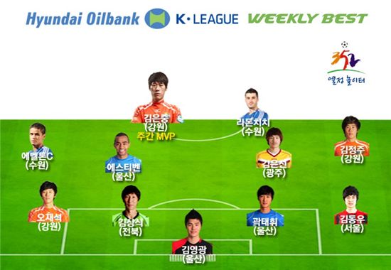 주간 베스트11 공격수 부문에는 김은중과 함께 11일 인천과의 원정경기에서 두 골을 넣은 라돈치치(수원)가 이름을 올렸다. 미드필더는 에벨톤C(수원), 에스티벤(울산), 김은선(광주), 김정주(강원)가 포함됐다.