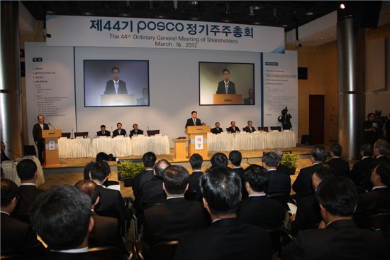 정 회장은 16일 서울 대치동 포스코센터에서 열린 주주총회에서 연임이 확정된 뒤 "지난 3년간은 글로벌 초우량기업의 초석을 다지는 기간이었다"며 이같이 밝혔다.