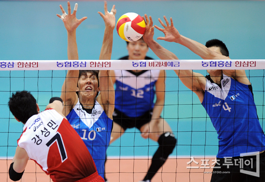 [수원=스포츠투데이 정재훈 기자] 27일 오후 수원실내체육관에서 열린 'NH 농협 2011-2012 V리그' 남자부 KEPCO와 현대캐피탈의 준플레이오프 2차전에서 문성민이 강성민의 스파이크를 블로킹하고 있다.