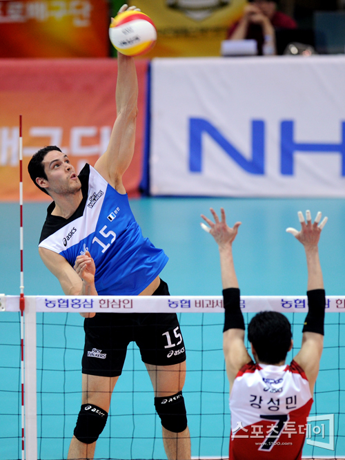 [수원=스포츠투데이 정재훈 기자] 27일 오후 수원실내체육관에서 열린 'NH 농협 2011-2012 V리그' 남자부 KEPCO와 현대캐피탈의 준플레이오프 2차전에서 스파이크를 시도하는 수니아스.
