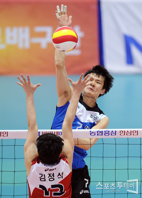 [수원=스포츠투데이 정재훈 기자] 27일 오후 수원실내체육관에서 열린 'NH 농협 2011-2012 V리그' 남자부 KEPCO와 현대캐피탈의 준플레이오프 2차전에서 이선규가 스파이크를 때리고 있다.