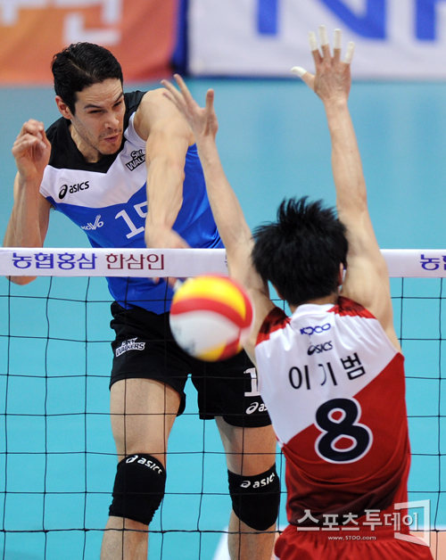 [수원=스포츠투데이 정재훈 기자] 27일 오후 수원실내체육관에서 열린 'NH 농협 2011-2012 V리그' 남자부 KEPCO와 현대캐피탈의 준플레이오프 2차전에서 수니아스가 스파이크를 때리고 있다.