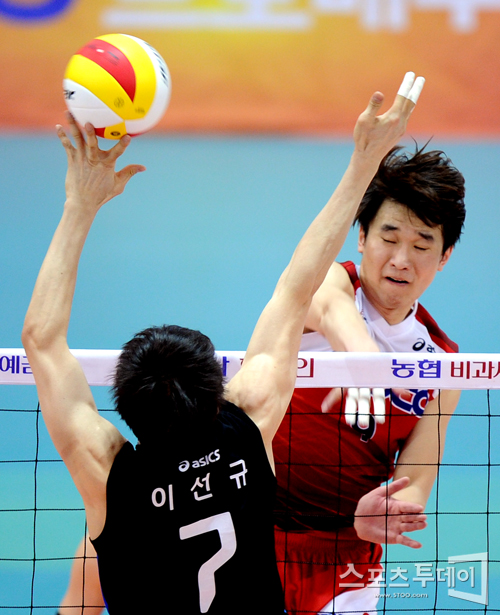 [수원=스포츠투데이 정재훈 기자] 27일 오후 수원실내체육관에서 열린 'NH 농협 2011-2012 V리그' 남자부 KEPCO와 현대캐피탈의 준플레이오프 2차전에서 최석기의 스파이크가 이선규의 손가락에 걸리고 있다.