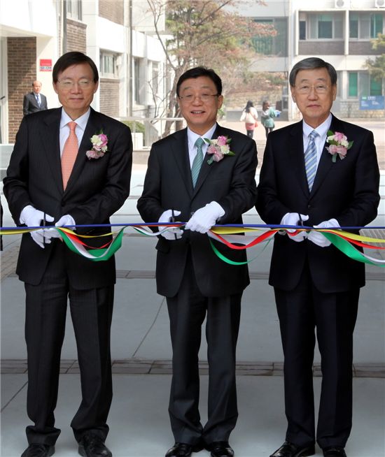 두산그룹이 건축비 전액을 기부해 지은 서울대 두산인문관 준공식이 28일 열렸다. 두산인문관은 고(故) 박두병 두산 초대 회장의 유지에 따라 1974년 건립된 연강기념관(인문대 8동 강의실)을 재건축한 것이다. 이날 준공식에는 (사진 왼쪽부터) 임정기 서울대 연구부총장, 오연천 서울대 총장, 박용현 두산 회장 등이 참석했다.