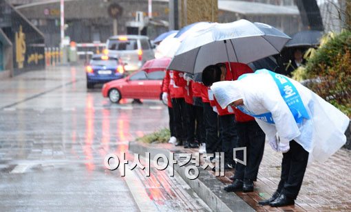 [아시아경제 윤동주 기자] 전국적으로 제법 많은 양의 봄비가 내린 3일 서울 송파구의 한 아파트 단지내에서 새누리당 송파을 후보로 나선 유일호 후보와 선거운동원들이 지지를 호소하고 있다.