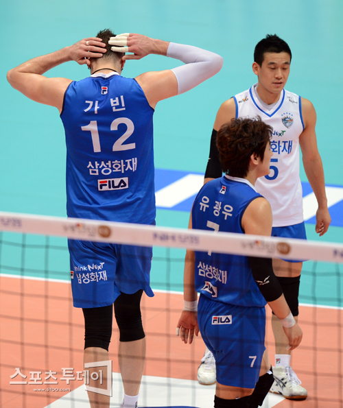[인천=스포츠투데이 정재훈 기자] 11일 오후 인천 도원체육관에서 열린 '2011~2012 NH 농협 V리그' 대한항공과 삼성화재의 챔피언결정전 3차전에서 가빈의 스파이크가 연이어 저지되자 허탈한 삼성화재 진영.
