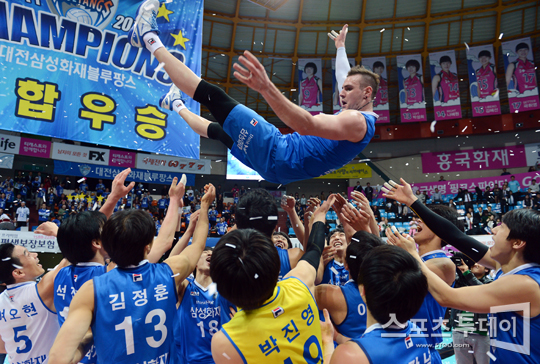 [인천=스포츠투데이 정재훈 기자] 12일 오후 인천 도원체육관에서 열린 '2011~2012 NH 농협 V리그' 챔피언결정전 4차전에서 삼성화재가 대한항공을 세트스코어 3:0으로 누르고 통합우승을 차지했다. 동료들로부터 행가래받는 가빈.