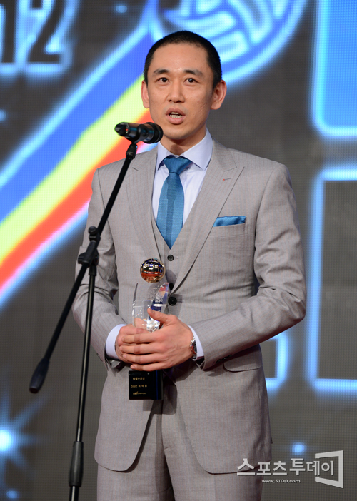 [스포츠투데이 정재훈 기자] 23일 오후 장충체육관에서 NH농협 2011-2012 V리그 시상식이 열렸다. 특별수훈상을 수상한 현대캐피탈 최태웅이 소감을 밝히고 있다.