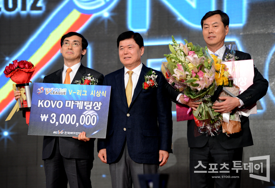 [스포츠투데이 정재훈 기자] 23일 오후 장충체육관에서 NH농협 2011-2012 V리그 시상식이 열렸다. 도로공사와 삼성화재가 KOVO 마케팅상을 수상하고 있다.
