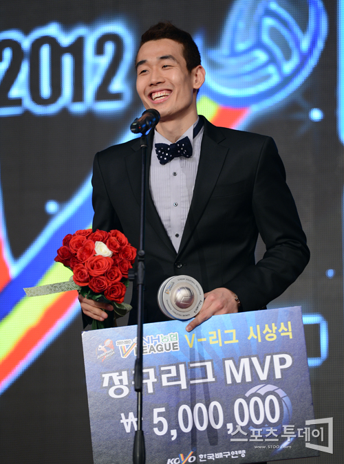 [스포츠투데이 정재훈 기자] 23일 오후 장충체육관에서 NH농협 2011-2012 V리그 시상식이 열렸다. 출국한 MVP 가빈을 대신해 대리수상한 삼성화재 주장 고희진이 소감을 전달하고 있다.