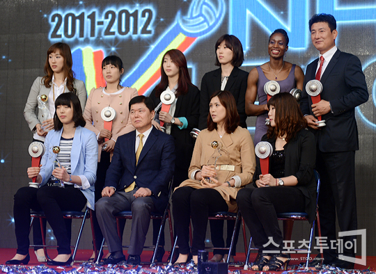 [스포츠투데이 정재훈 기자] 23일 오후 장충체육관에서 NH농협 2011-2012 V리그 시상식이 열렸다. 여자부 수상자들이 포토타임을 갖고 있다.