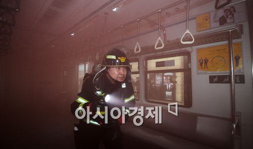 [아시아경제 윤동주 기자] 27일 서울 동작역에서 실시된 지하철 테러대응 화재 대비훈련에서 전동차 내에 테러범이 투여한 폭탄으로 화재가 발생하자 소방대원들.