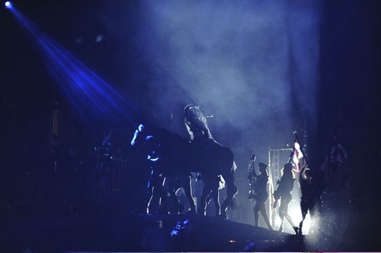 그 큰 공연장에서 키 155cm의 레이디 가가를 작은 스크린으로 보면서 확인할 수 있는 건 큰 세트와 옷뿐이다. 발끝까지 덮는 드레스, 빤딱빤딱 빛나는 가죽 바이커 패션, 생고기 무늬를 입힌 원피스. 관객이 집중해서 보면 발견할 수 있는 디테일한 요소 같은 건 없다. 대신 세트는 거대하고, 옷의 소재와 소품들은 독특하며, 레이디 가가와 무용수들은 강하고 큰 동작들을 똑같이 춘다. ‘Highway unicorn’에는 실제로 말이 등장하고, ‘Born this way’에서는 레이디 가가가 걷기도 불편할 드레스를 입고 무용수들과 함께 열심히 춤을 춘다. 스크린으로 봐도 레이디 가가의 표정도 제대로 확인할 수 없는 상황에서 기억에 남는 건 큼직큼직한 한 순간의 이미지다. ‘Alejandro’에서 남녀 무용수들이 소파 위에서 몸을 더듬어도 잠실 주경기장 1층 R석에서 촉수와 촉수가 엉키는 뜨겁고 촉촉한 분위기 따위 알게 뭐야. 소파와 무용수들이 엉켜 있는 강렬한 이미지만 기억에 남는다.