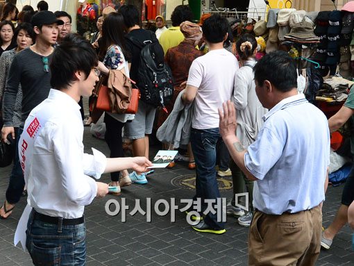 [아시아경제 윤동주 기자] 1일 서울 중구 명동 쇼핑거리에 롯데백화점 면세점 직원의 호객 행위로 한국을 찾은 외국인 관광객이 짜증을 내고 있다.