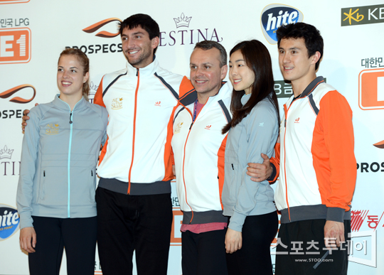 [스포츠투데이 정재훈 기자] 3일 오후 올림픽공원 체조경기장 특설아이스링크에서 '김연아 아이스쇼-E1 올댓스케이트 스프링 2012' 리허설 및 기자회견이 열렸다. 기자회견에 참석한 카롤리나 코스트너, 에반 라이사첵, 데이빗 윌슨, 김연아, 패트릭 챈이 포즈를 취하고 있다.