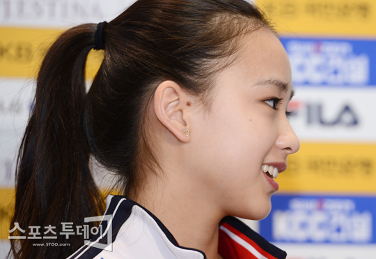 [인천=스포츠투데이 정재훈 기자] '리듬체조 요정' 손연재가 '2012 국제체조연맹(FIG) 리듬체조 월드컵 시리즈'를 마치고 22일 오전 인천공항을 통해 귀국했다. 입국 게이트 옆에서 진행된 인터뷰에서 손연재가 취재진의 질문에 답하고 있다.