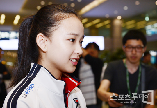 [인천=스포츠투데이 정재훈 기자] '리듬체조 요정' 손연재가 '2012 국제체조연맹(FIG) 리듬체조 월드컵 시리즈'를 마치고 22일 오전 인천공항을 통해 귀국했다. 입국 게이트 옆에서 진행된 인터뷰에서 손연재가 취재진의 질문에 답하고 있다.