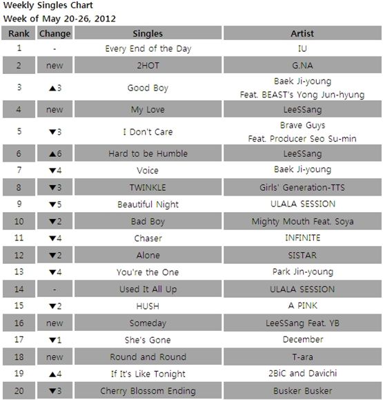Singles chart for the week of May 20-26, 2012 [Gaon Chart]