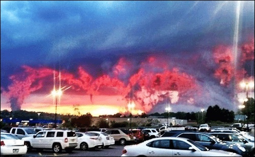 [아시아경제 온라인이슈팀]지옥의 불길처럼 치솟는 붉은 연기, 마치 대형 화재가 난듯하지만 사실은 적란운과 노을이 합작해서 만든 자연풍경이다.