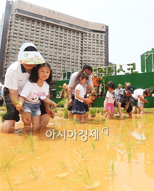 [아시아경제 양지웅 기자] 14일 서울광장에서 열린 제 1회 도시농업박람회 개막식에서 어린이들이 모내기 체험을 하고 있다.