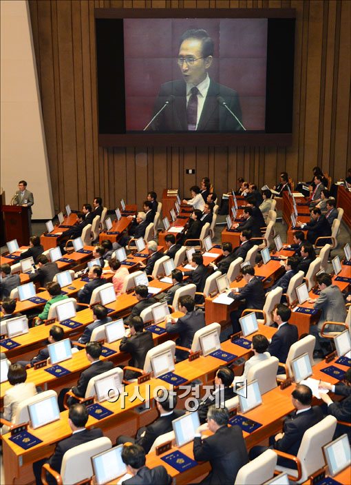 [아시아경제 윤동주 기자] 19대 국회 개원식이 열린 2일 서울 여의도 국회 본회의장에서 이명박 대통령이 개원 연설을 하고 있다.