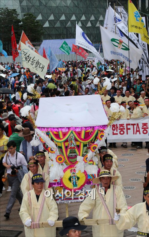 [아시아경제 윤동주 기자] 3일 서울광장에서 열린 한·중 FTA 협상중단 농어민 대회에 참석한 농민들이 집회를 마친후 서울역까지 거리 행진을 하고 있다.