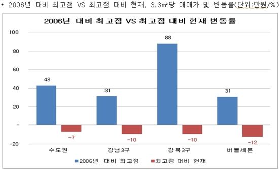 부동산정보업체 부동산써브가 수도권 아파트(주상복합 포함) 345만4630가구를 대상으로 2006년부터 현재까지 3.3㎡당 매매가를 분석한 결과, 2006년부터 최고점인 2008년 9월까지의 변동률은 43%를 기록한 반면 최고점 이후(2008년 9월) 현재까지의 변동률은 -7%를 기록한 것으로 조사됐다.