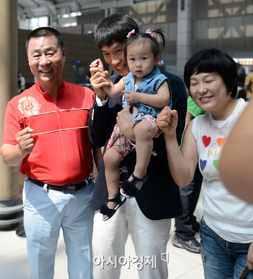 [인천=아시아경제 정재훈 기자] 2012 런던 올림픽 선수단 본진이 20일 오후 인천공항을 통해 런던으로 출국했다. 출국에 앞서 가족들과 화이팅을 외치는 한 선수.