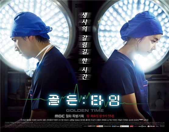 Lee Sun-kyun(left) and Hwang Jung-eum(right) wearing operating gowns in the poster of MBC's ongoing drama "Golden Time," which kicked off the run on July 9, 2012. [MBC]
