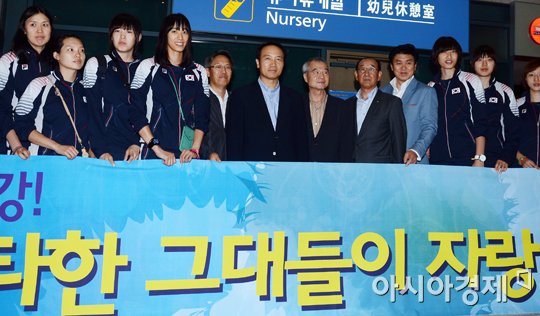 [인천=아시아경제 정재훈 기자] 2012 런던 올림픽에서 4위의 성적으로 선전한 여자배구 대표팀이 13일 오후 인천국제공항을 통해 귀국했다. 임태희 대한배구협회장이 공항을 찾아 선수단과 기념촬영을 하고 있다.