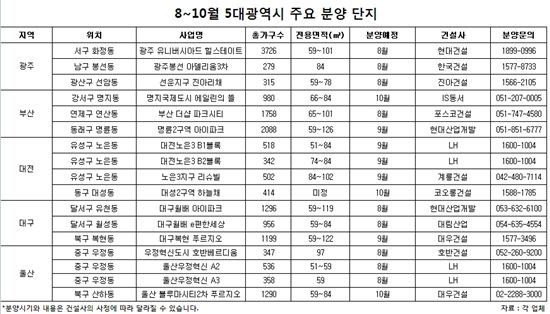 18일 부동산 정보업체들이 연내 지방 5대광역시의 물량을 조사한 결과 주상복합을 포함 총 28곳에서 1만9369가구가 분양된다. 지역별로는 ▲부산 9곳 7456가구 ▲대구 5곳 4393가구 ▲대전 6곳 2537가구 ▲울산 4곳 2530가구 ▲광주 4곳 2453가구 순이다.