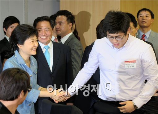 [아시아경제 윤동주 기자] 박근혜 새누리당 대선후보가 23일 서울 영등포구 여의도 국회에서 열린 전국대학생총학생회 토론회에 참석해 학생들과 인사를 나누고 .
