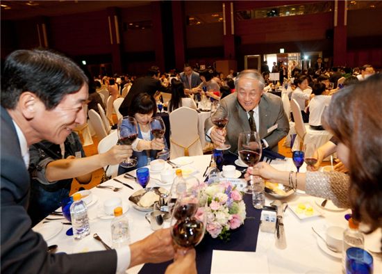우상룡 GS건설 해외사업총괄 사장(가운데)이 지난 11일 서울 삼성동 그랜드인터콘티넨탈호텔에서 열린 '해외근무직원 가족초청행사' 에서 직원 가족들과 건배를 하고 있다.